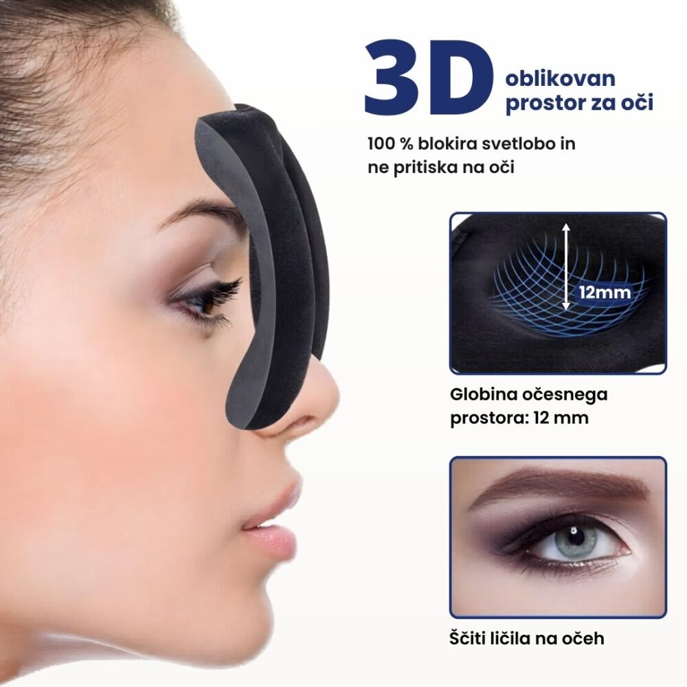 3D maska za spanje s svojo posebno obliko popolnoma blokira svetlobo in ustvari temno okolje, ki spodbuja hitrejše uspavanje in bolj kakovosten spanec.